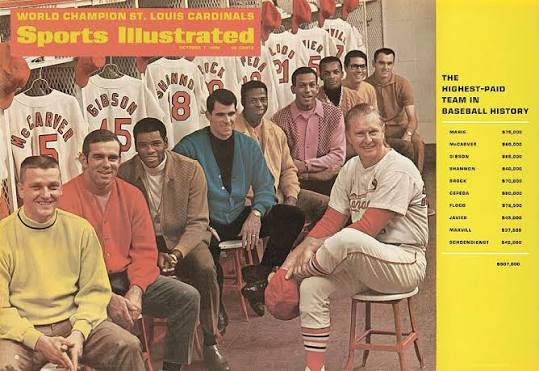 That tag and team graced the cover of Sports Illustrated for October 7, 1968, a fold-out showing the starting nine for the defending “World Champion St. Louis Cardinals” seated by their lockers with the “Manager of the Moneymen” and their salaries in order of appearance.